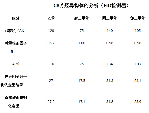 氣相色譜的一些主要檢測器如FID和TCD對某些組分,如同系物的校正因子相近或有一定的規(guī)律,從文獻中可以查到或進行計算。當(dāng)校正因于相近時,可直接用峰面積歸一化進行定量分,例如下表中給出了C8芳烴異構(gòu)體的分析結(jié)果。四個組分的FID檢測器的質(zhì)量校正因子在0.96-1.00之間,結(jié)果給出了用校正因子進行歸一化法的定量結(jié)果和直接用峰面積進行歸一化的定量結(jié)果。