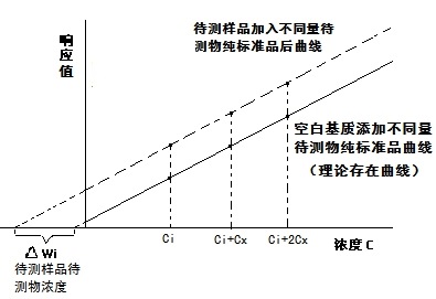 具體操作是取等量待測樣品若干份,加入不同濃度的待測組分的標(biāo)準(zhǔn)溶液進行分析,以濃度為橫坐標(biāo),峰面積為縱坐標(biāo)繪制工作曲線。工作曲線延長線在橫坐標(biāo)上的截距即為樣品中待測組分的濃度。由于待測組分以及加入的標(biāo)準(zhǔn)溶液處在相同的樣品基體中,相當(dāng)于把待測試樣作為了背景值。