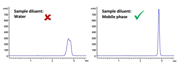 當(dāng)使用親水相互作用液相色譜法(HILIC)時(shí),樣品稀釋劑的選擇對(duì)峰形有顯著的影響。稀釋劑的錯(cuò)誤選擇可能會(huì)導(dǎo)致色譜峰形差,峰分裂和保留時(shí)間的不穩(wěn)定。