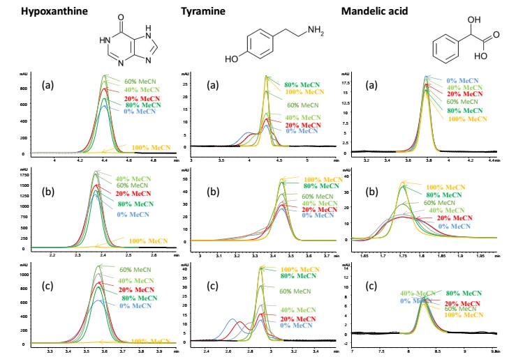 次黃嘌呤(極性中性)的峰形一般隨著乙腈濃度的增加而改善,最佳的有機(jī)溶劑含量在60-80%左右。酪胺(堿性)在低百分比有機(jī)相稀釋劑條件下,HILIC-B和HILIC-N上出現(xiàn)分裂峰, HILIC-A峰形很差。當(dāng)乙腈的濃度大于60%,峰形得到顯著的改善。扁桃酸的峰形在HILIC-B和HILIC-N相上受稀釋劑的影響較小,而對(duì)于HILIC-A相,在高水濃度下峰形較差??偟膩?lái)說(shuō),從這個(gè)數(shù)據(jù)集合來(lái)看,對(duì)于這個(gè)應(yīng)用,樣品推薦使用由60-80%有機(jī)相組成的稀釋劑。