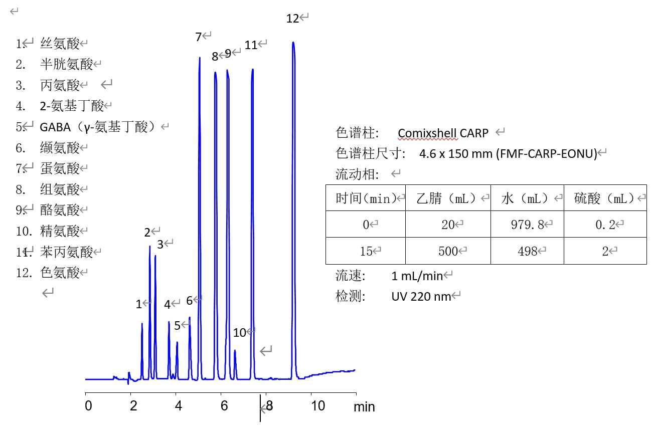 Comixshell CARP 色譜柱對12種非衍生氨基酸的HPLC分離(沒有離子對試劑)