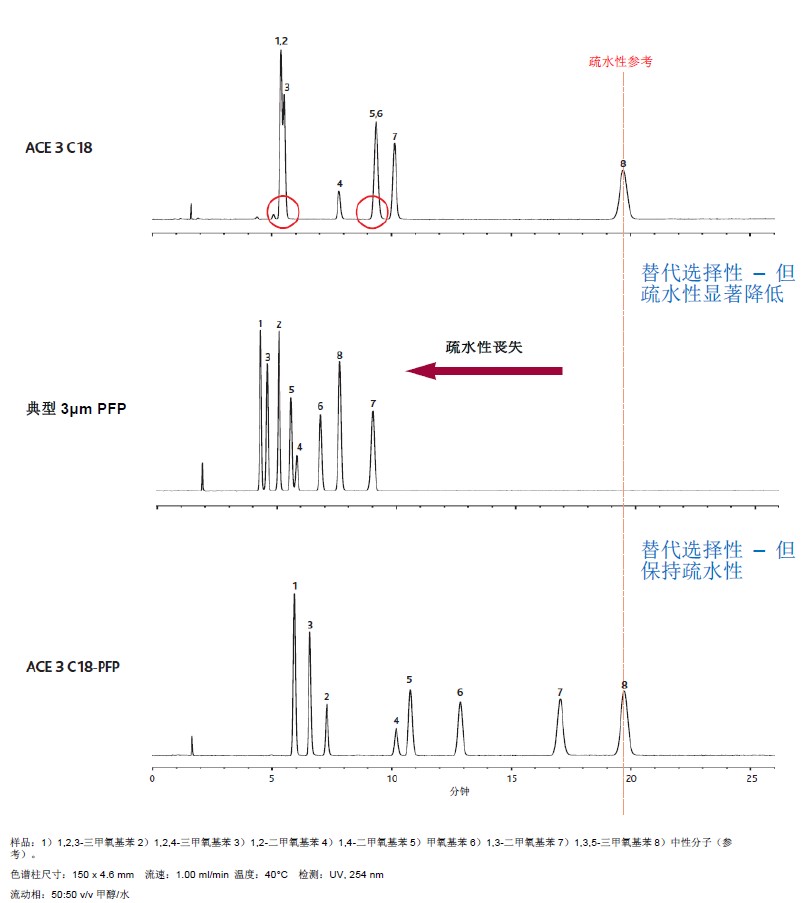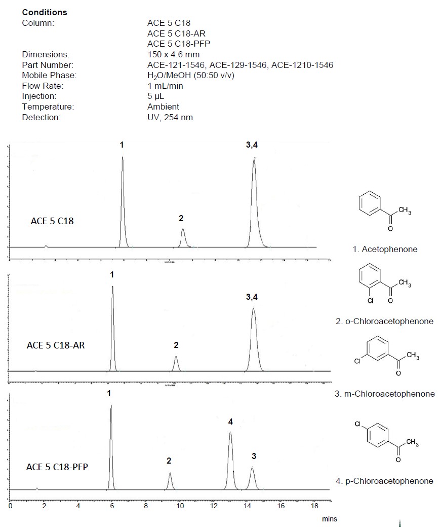 所以,ACE C18-PFP常被用于涉及鹵代芳香族化合物、位置異構體和具有不同形狀約束的分析物的分離。