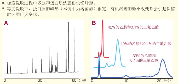 在RP-HPLC中,蛋白和多肽的保留和一般的小分子化合物有所不同,等度洗脫對于蛋白質(zhì)的分離作用很小,有機相比例小的變化會引起蛋白質(zhì)保留的大的變化。