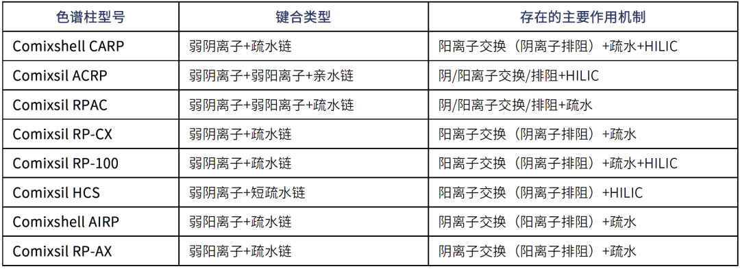 2021年,我們在混合作用(mixed-mode)固定相設(shè)計上繼續(xù)開疆拓土,開發(fā)出了Comixsep系列的三款多種作用力組合的反相固定相;