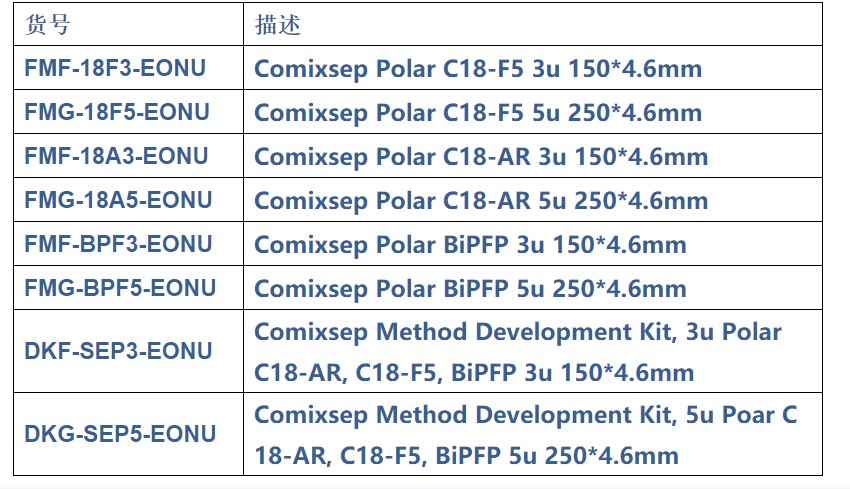 它們在疏水作用的基礎(chǔ)上增加了很強(qiáng)的氫鍵、π-π、偶極-偶極等作用,使色譜柱具有了和一切現(xiàn)有常規(guī)C18等反相柱不同的選擇性,極大地增加了解決復(fù)雜分析問題的成功率。同時,Comixsep系列色譜柱的操作和常規(guī)C18一樣,無需特別的沖洗、平衡和保存條件,使用非常友好。