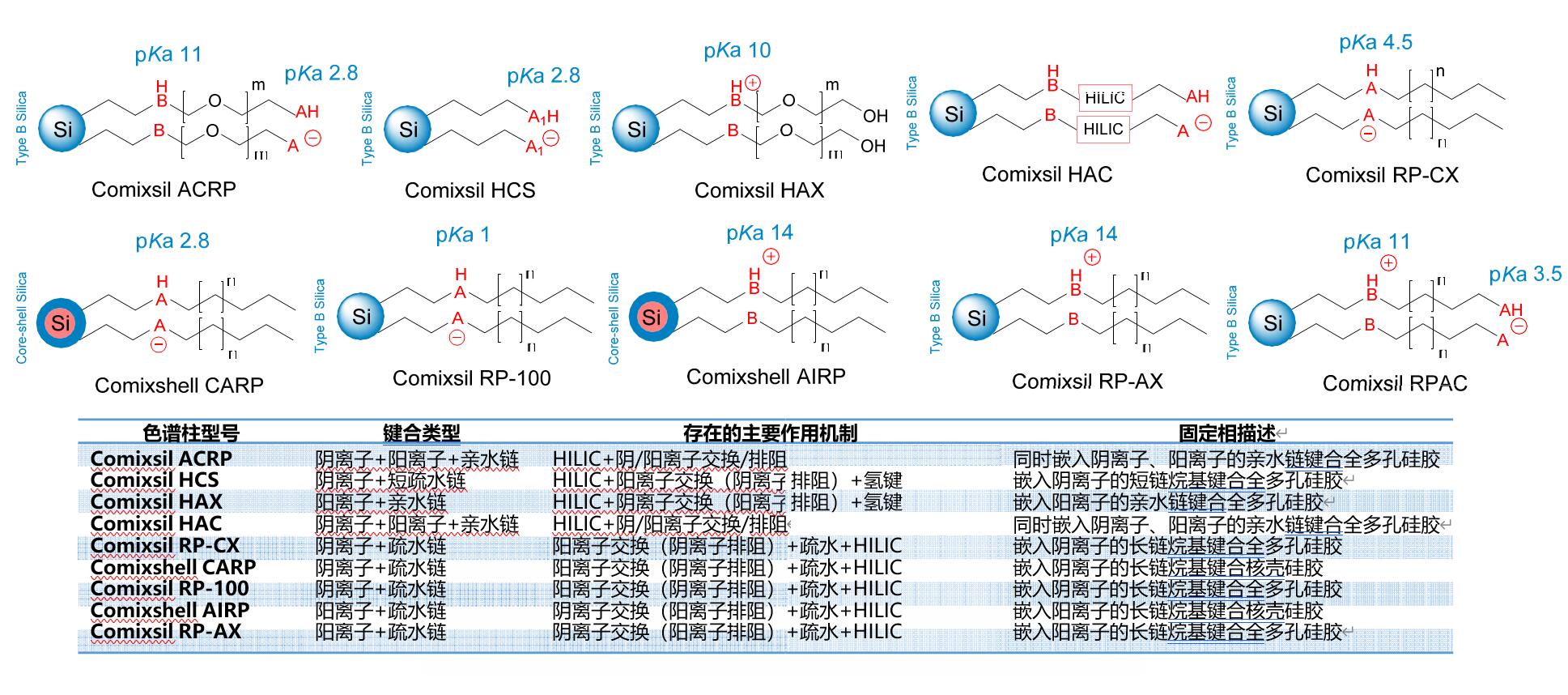 菲羅門公司的Comix系列為創(chuàng)新的混合作用(Mixed-mode)液相色譜柱,通過在疏水的碳鏈或者親水鏈上嵌入離子基團,可以實現(xiàn)在不同的流動相條件下提供離子交換/排阻、Hilic和疏水等作用,可以為大極性化合物和成分之間性質差異大的樣品的分析提供新的解決方案。以下為具體固定相信息: