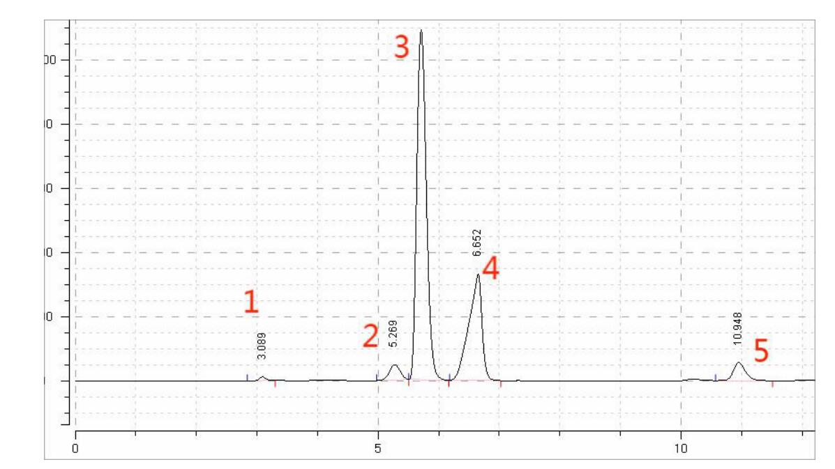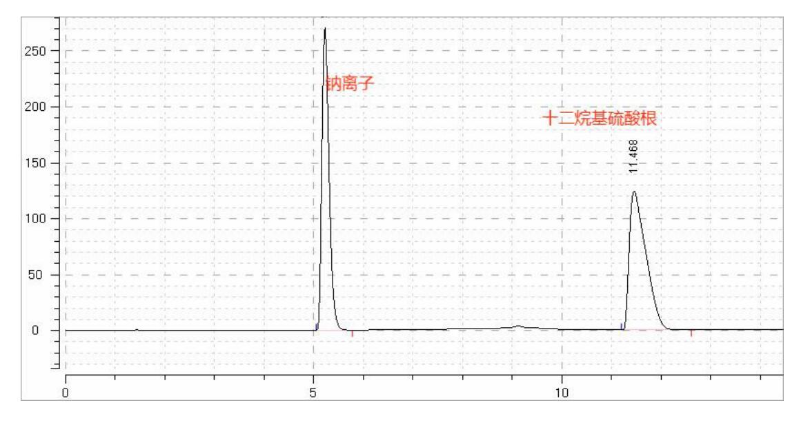圖譜 1: 各峰分別為:1、庚烷磺酸根離子 2、辛烷磺酸根離子 3、鈉離子 4、癸烷磺酸根離子 5、十二烷基磺酸根離子(十二烷基硫酸根離子同位置出峰)