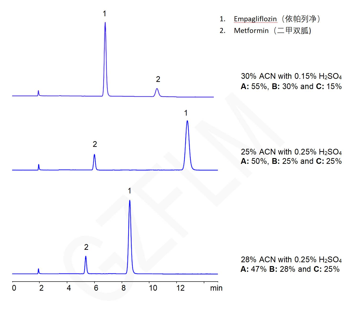 說(shuō)明:酸強(qiáng)度改變依于陽(yáng)離子交換的二甲雙胍的保留強(qiáng)度。ACN比例決定依于疏水的依帕列凈的保留強(qiáng)度。兩者調(diào)整可以改變兩個(gè)峰的出峰順序。