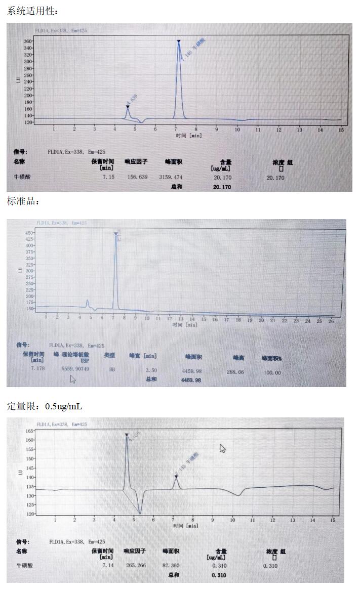 用牛磺酸標樣做重現性實驗,用 20ug/mL 濃度的標樣 6 針,其保留時間的相對標準偏差(RSD)是 0.062%, 峰面積的相對標準偏差(RSD)是 0.126%。