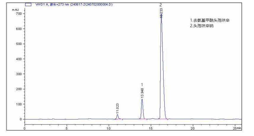 1. **系統適用性**: - 頭孢呋辛峰與去氨甲酰頭孢呋辛峰之間的分離度均大于**3.0**。 - 頭孢呋辛峰與后相鄰雜質峰間的分離度均大于**2.0**。 - 這些參數均符合中國藥典的測試要求,為頭孢呋辛鈉藥物的質量保證提供了可靠的檢測依據。