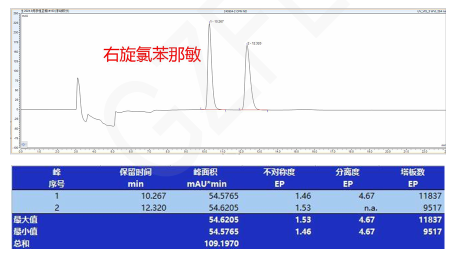 App ID: FLM-B240012 馬來酸氯苯那敏的手性拆分 色譜柱:Chiral ND(2) 5μm 250*4.6mm (貨號(hào):FMG-AC5-A01-NFC) 流動(dòng)相:正相(咨詢銷售) 流速:1.0 mL/min 檢測(cè)波長:254nm 柱溫:30℃ 樣品濃度:1mg/ml 進(jìn)樣量:10μl 色譜圖:
