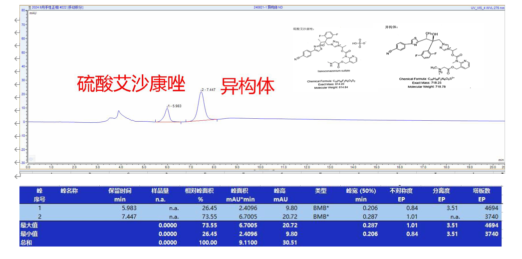 App ID: FLM-B240015 硫酸艾沙康唑及其對映異構體的手性拆分 色譜柱:Chiral ND(2) 5u 250*4.6mm (P/N: FMG-AC5-A01-NFC) 流動相:正相(咨詢) 柱溫:25℃ 流速:0.8 mL/min 檢測波長:275nm 濃度:N/A 溶劑:30%乙腈 圖譜 1: