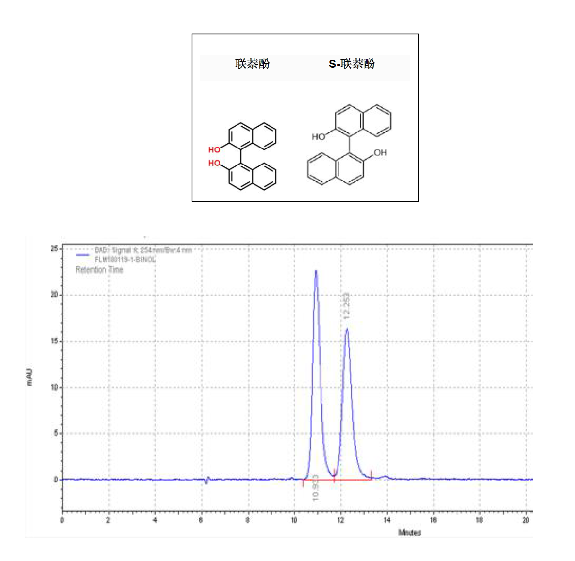 App ID: FLM-B250006 聯(lián)萘酚與S-聯(lián)萘酚的分離 色譜柱:Chiral INC 250*4.6mm,5um (貨號(hào):FMG-JY5-I03) 流速:0.5 mL/min 檢測:波長254nm, 柱溫:25°C 樣品濃度:N/A 進(jìn)樣量:1μ 溶劑:水:甲醇=40:60(V:V) 流動(dòng)相:咨詢銷售