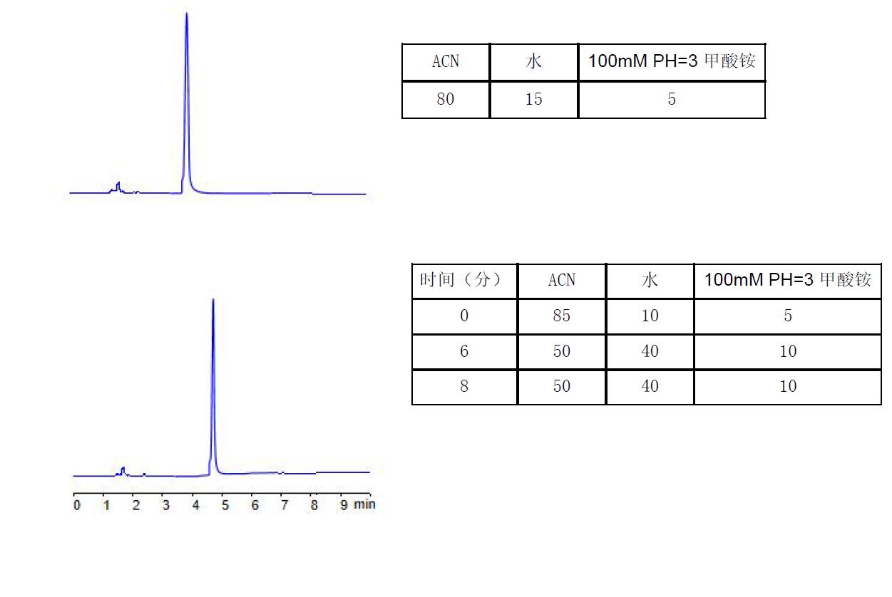 說明:以上應用可以簡單在酸性體系下分析尼古丁。如果是用于MS 檢測器。可選擇Comxsil HAC 3u 50*2.1mm(P/N:FMB-HAC3-BONU)柱,0.2ml/min, ACN:5mM PH=3 甲酸銨=85:15,預計2min 出峰分析完畢。 該方法可避免C18 柱酸性條件下的弱保留,拖尾;避免Hilic 柱酸性條件下的重現(xiàn)性問題,避免不喜歡用堿性條件的客戶群體。如果愿意用堿性體系的,菲羅門公司的Titank C18 柱,ACN 與碳酸氫銨的體系,也可以很好分析尼古丁,可向銷售代表索取應用。 |