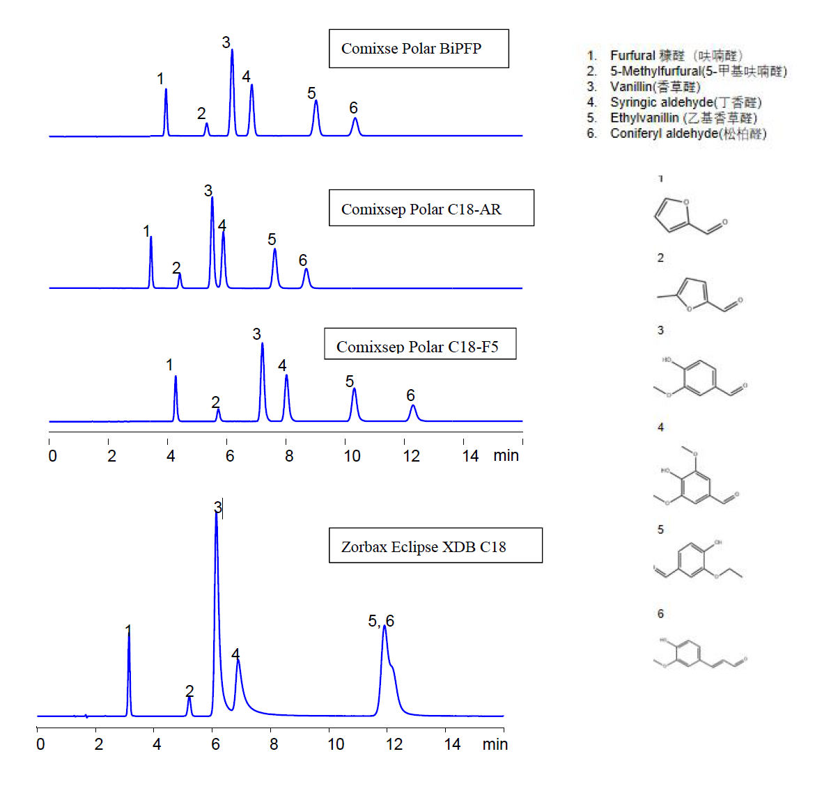 Comixsep 分析六種結構相似醛的選擇性對比