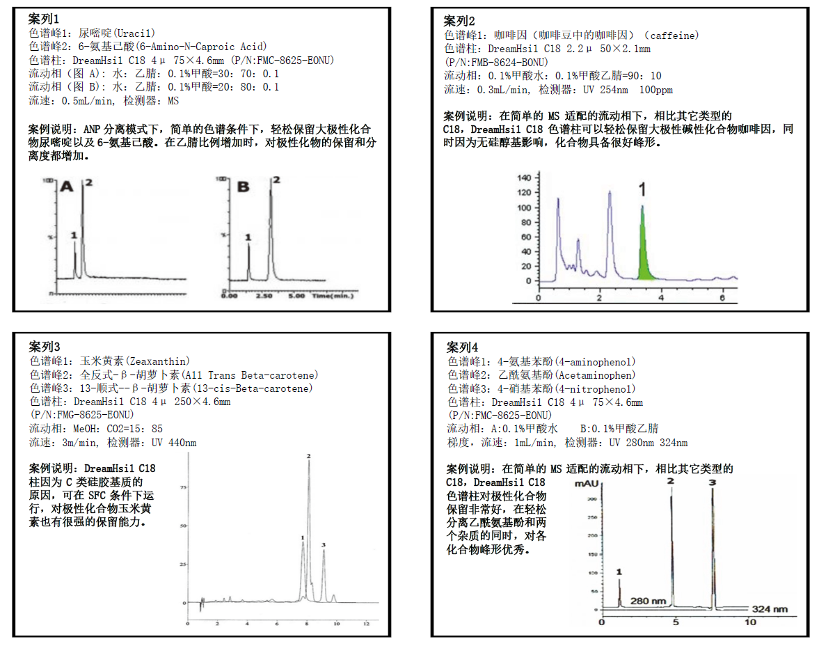 此固定相可以在100%水相和100%有機(jī)相下使用。它最大的用途是在反相模式下。該固定相是疏水性很強(qiáng)的固定相,相比一般的B類硅膠C18,有更強(qiáng)的疏水分離能力。 當(dāng)它在高水或純水條件下使用時,對極性的酸、堿化合物有很好的選擇性,并不需要在此柱上采用 ANP 模式。 此固定相可承受各種溶劑在流動相中的添加,不易被離子對改性。 DreamHsil C18可以作為實(shí)驗(yàn)室的強(qiáng)有力工具因?yàn)樗啾菳 類的 C18 更穩(wěn)定更耐用。它歸屬于USP L1 的分類。可以用于取代那些在其它類型C18 上,方法不穩(wěn)定,含離子對試劑方法的應(yīng)用。