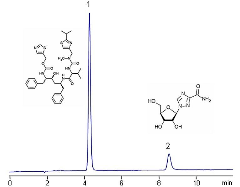 利托那韋是一種抗逆轉(zhuǎn)錄病毒藥物,屬于蛋白酶抑制劑類,用于治療 HIV 感染和 AIDS。利托那韋具有強(qiáng)疏水性且不可電離,它在反相色譜上保留過強(qiáng)。利巴韋林是一種抗病毒藥物, 可以有效對抗許多 DNA 和 RNA 病毒。利巴韋林屬于核苷酸抗代謝藥物,具有強(qiáng)親水性。對于 HPLC 分離,利托那韋和利巴韋林是兩種性質(zhì)差異非常大的藥物。可以采用親水作用色譜, 在 Primesep N 上對強(qiáng)疏水和強(qiáng)親水藥物進(jìn)行分離。
