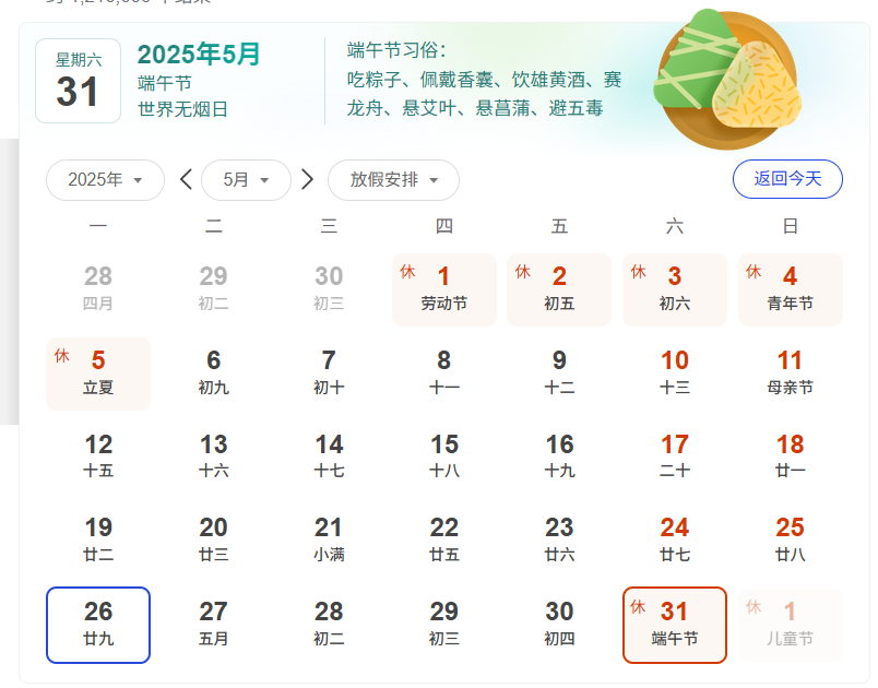 我司端午節(jié)放假時(shí)間為2025年5月31日至6月2日放假,共3天。