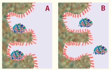 圖4. 進(jìn)入色譜柱的蛋白質(zhì)被吸附在柱頂端附近的疏水表面上(A)并且一直保持吸附,直至有機(jī)改性劑的濃度達(dá)到特定值,此時(shí)蛋白質(zhì)從表面解吸附(B)。