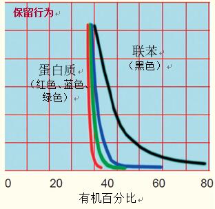 小分子的保留行為隨著有機(jī)溶劑濃度的改變而緩慢改變時(shí)(圖5,聯(lián)苯),一旦有機(jī)溶劑的濃度達(dá)到所需要的值,蛋白質(zhì)的保留行為即發(fā)生突然改變,引起保留時(shí)間的快速變化(圖5,蛋白質(zhì))。