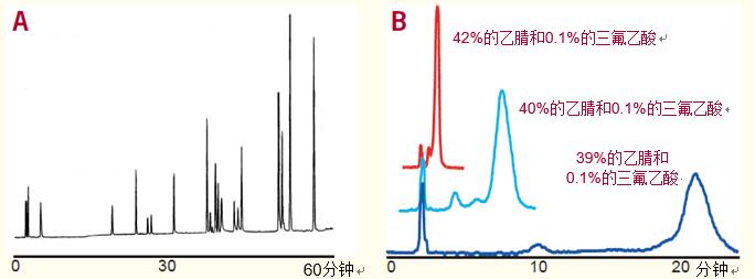 由于有機(jī)溶劑濃度的微小變化會(huì)引起的顯著的保留行為變化,等度洗脫很少被用于蛋白質(zhì)中,因?yàn)榉遄儗捔?,而有機(jī)溶劑的微小改變會(huì)導(dǎo)致蛋白質(zhì)保留行為的巨大變化(圖6B)。