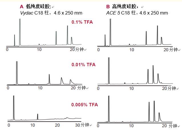 硅膠純度。高效液相色譜柱所用硅膠填料的純度對分離性能至關重要。金屬離子雜質會導致峰拖尾和分辨率下降,如圖7A所示(0.01%和0.005%的TFA)。
