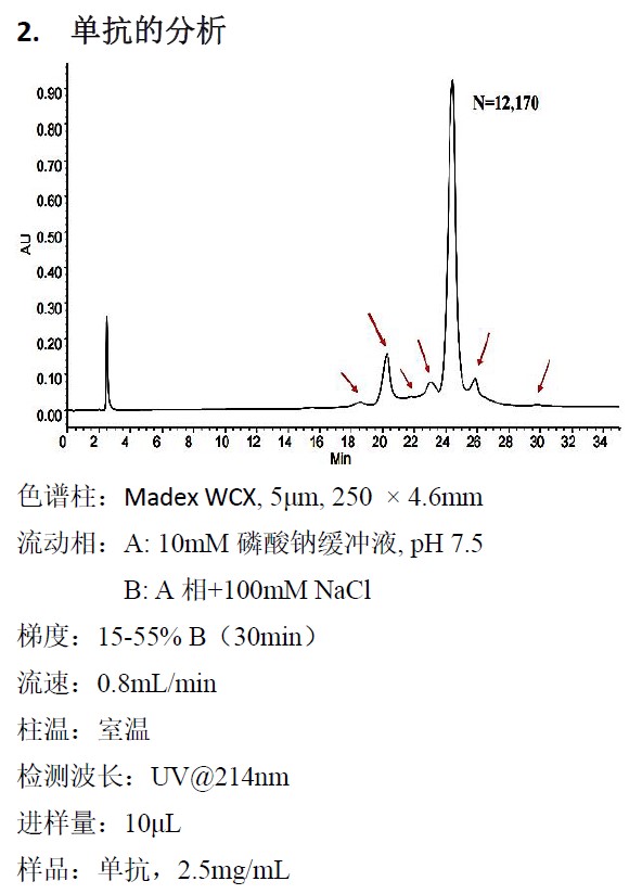 離子交換色譜,是根據(jù)蛋白質(zhì)分子在一定PH值和離子強(qiáng)度條件下所帶電荷的差異進(jìn)行分離的方法。Madex 系列離子交換色譜柱以聚苯乙烯/二乙烯苯(PS/DVB)顆粒為填料,并在其表面鍵合有一層高度親水的納米厚度的中性聚合物薄膜,最后再將離子交換官能團(tuán)致密、均勻地鍵合在親水表面而制成。四種固定相互補(bǔ),其中,WCX 固定相是專為抗體分離而設(shè)計(jì)。