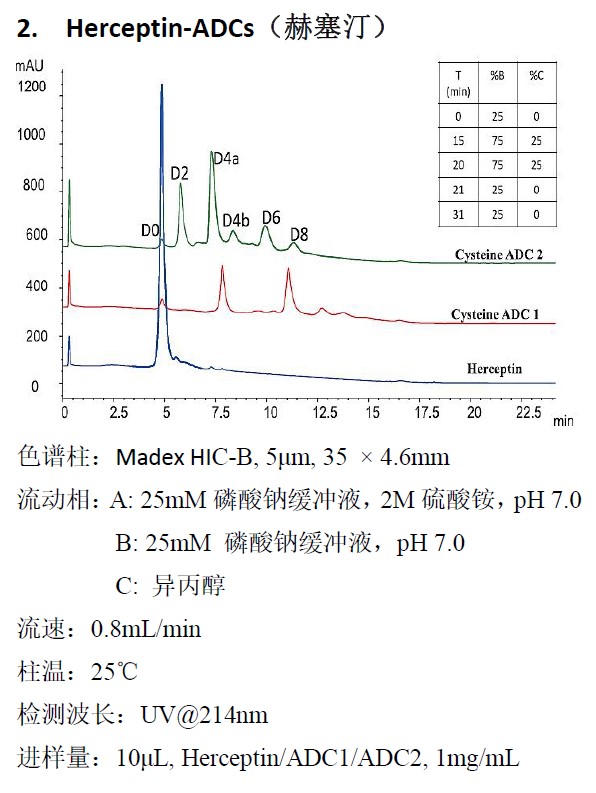 疏水作用色譜,在保持蛋白活性前提下,是根據(jù)分子表面疏水性差異分離蛋白質(zhì)的方法。Madex HIC-B 疏水作用色譜柱是以聚苯乙烯/二乙烯基苯(PS/DVB)為基質(zhì),通過獨(dú)有的化學(xué)鍵合技術(shù)將丁基均勻、致密地鍵合在基質(zhì)表面而制成。這種無孔單分散的疏水填料特別適合于分離單克隆抗體、抗體偶聯(lián)物(ADC)及具有疏水性差異的蛋白片段等。